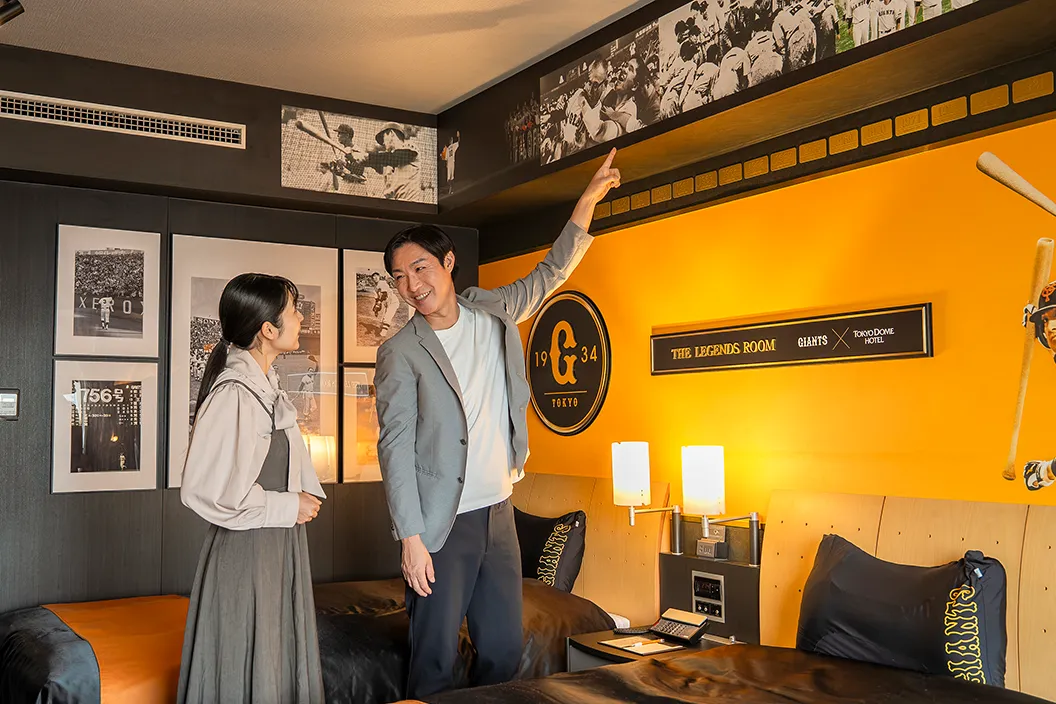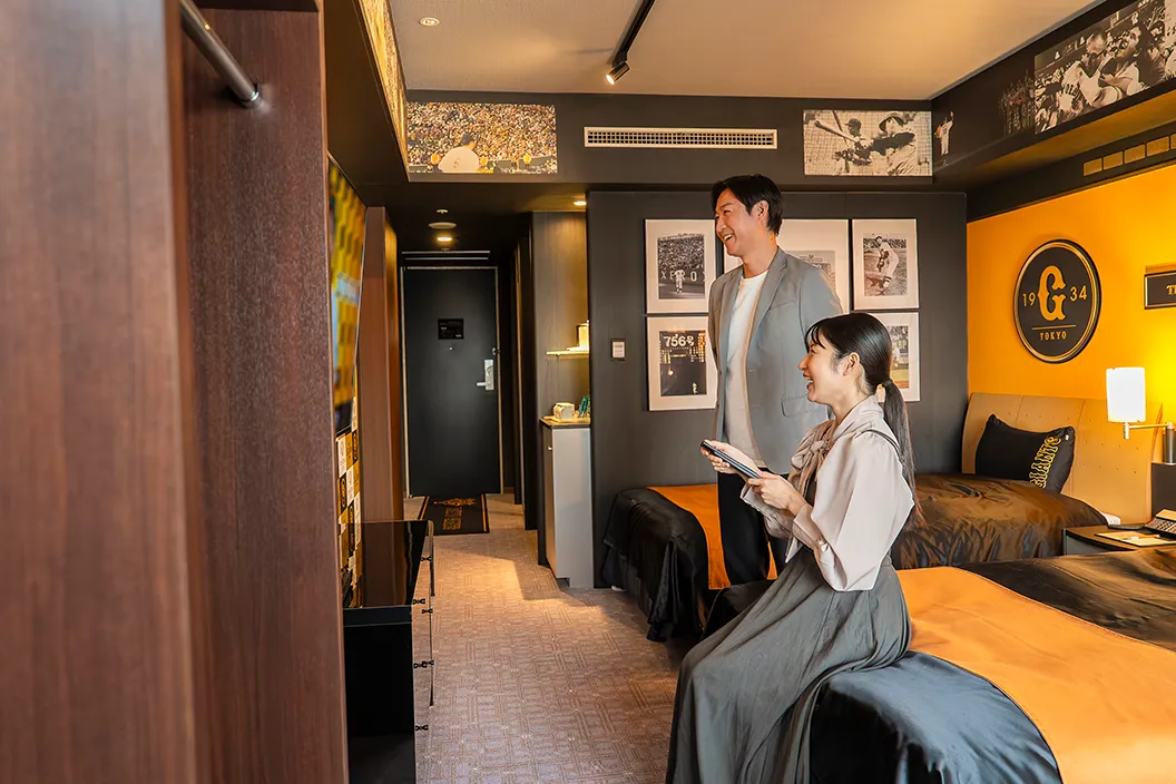この日、野球好きのカップルが滞在したのは、念願の【読売ジャイアンツ × 東京ドームホテル】コラボレーションルーム。客室に足を踏み入れると、そこはまさに"ジャイアンツ愛"に包まれた空間。監督用の椅子として使用されているゲーミングチェアや、選手ロッカーをイメージした収納スペース、ヒーローインタビュー風のフォトスポットなど、随所にジャイアンツへの愛とこだわりが詰まっています。壁には名シーンのパネルや写真が並び、子どものころからジャイアンツを応援してきたふたりは本当にうれしそう。