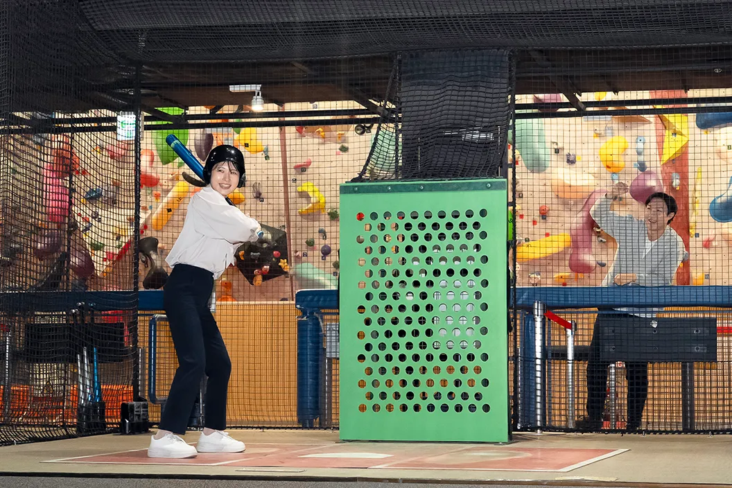 買い物のあとは、屋内型スポーツ施設「スポドリ!」のバッティングコーナーへ。2日間で見た名シーンを振り返りながら、自らバットを振って楽しみます。野球を見るだけでなく、プレイする楽しさをも味わえるのが、このエリアならではの魅力です。