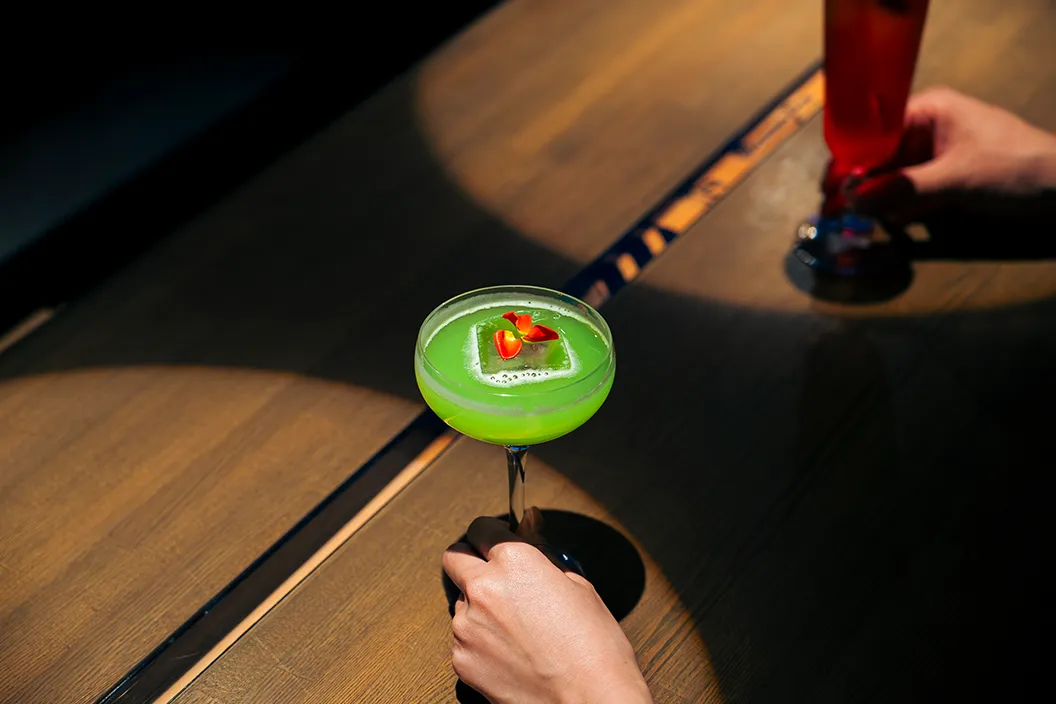 試合の興奮が冷めやらぬまま、ふたりが向かったのはホテル6階にあるバー「2000」。ここは、18.44mのロングカウンターが印象的な、全面ガラス張りの開放感あふれるバー。ちなみに、この長さは、ピッチャーマウンドからホームベースまでの距離と同じ。さらに、カウンターには国内外の有名選手のサイン入りバットが埋め込まれていたりと、野球ファンにはたまらない演出尽くしです。