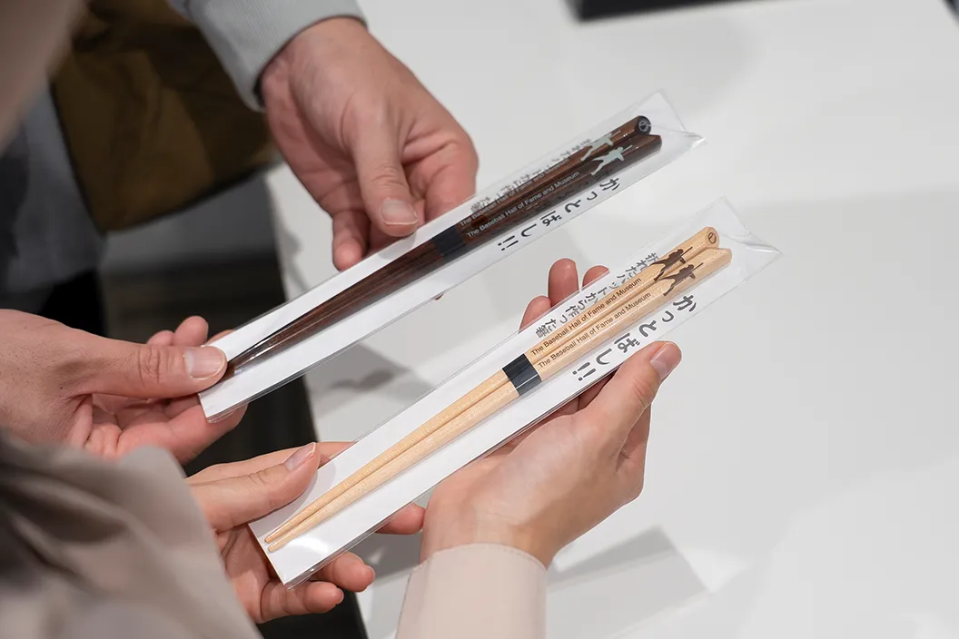 最後は野球殿堂博物館オリジナルグッズの、折れたバットや、バットを作る際にできる端材を使ったお箸「かっとばし!!」を購入。折れたバットを再生した商品なので、「ネバーギブアップ」や「チャレンジスピリット」の象徴として人気のアイテムだそうです。