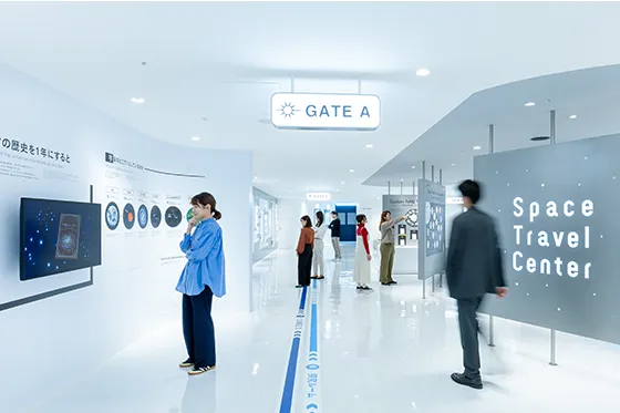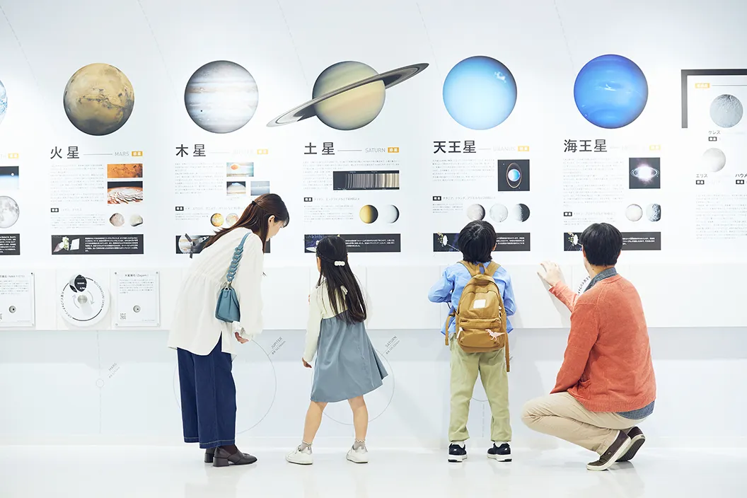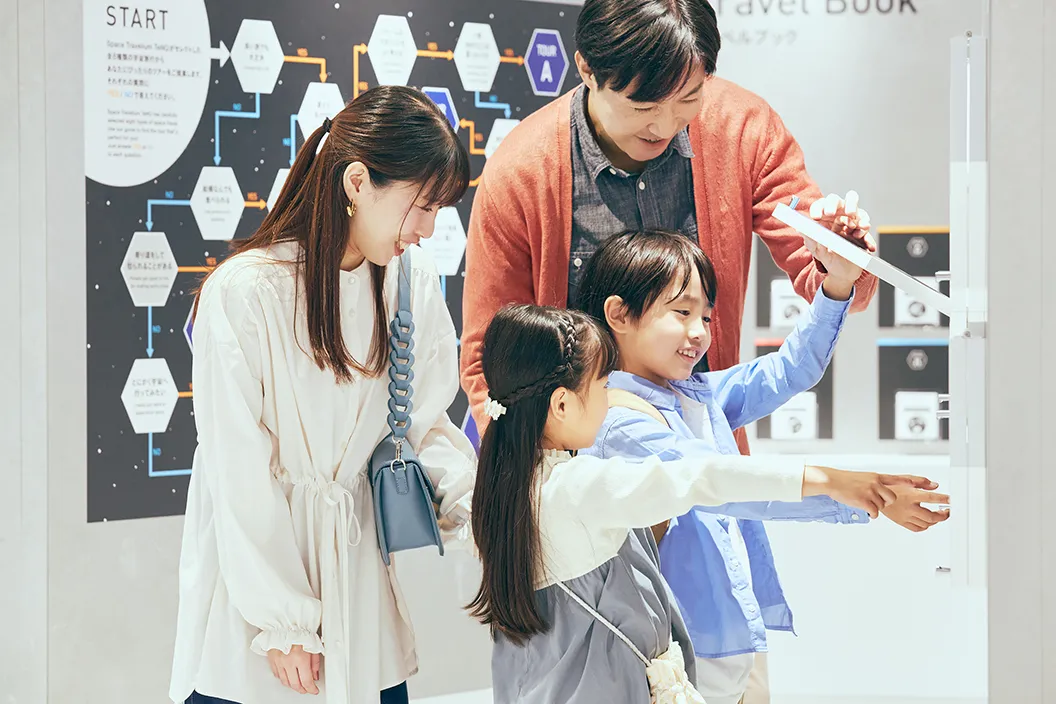 翌日、ホテルのチェックアウトを終えた家族が向かったのは、東京ドームシティ内にある「Space Travelium TeNQ(スペーストラベリウムテンキュー)」。宇宙が大好きな息子が、訪れるのを心待ちにしていた施設です。真っ白なエントランスを抜けると、宇宙にまつわる知識や体験を楽しめる「スペースターミナル」へ。展示を前に、熱心に見入る息子の姿に、両親や娘も次第に引き込まれていきます。