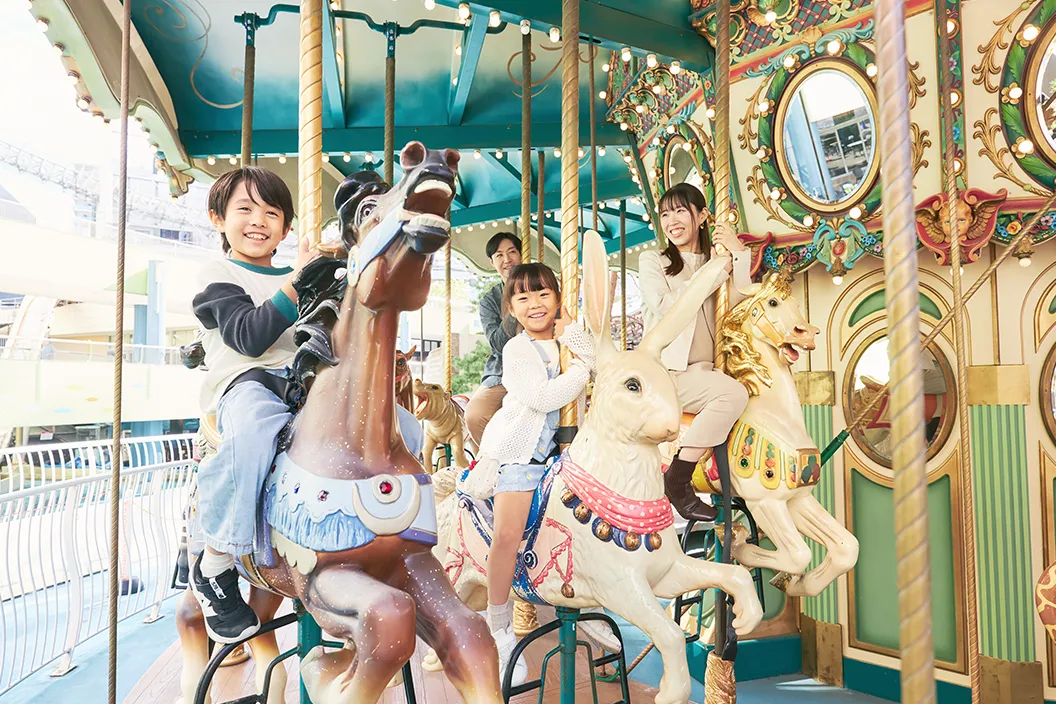 昼過ぎ、車でホテルに到着した家族。ロビーでスタッフに荷物を預け、まず向かったのは東京ドームシティ アトラクションズです。事前に購入していたヒーローショーの開演まで時間に余裕があったので、子どもの希望でメリーゴーラウンド「ヴィーナスラグーン」に乗ることに。