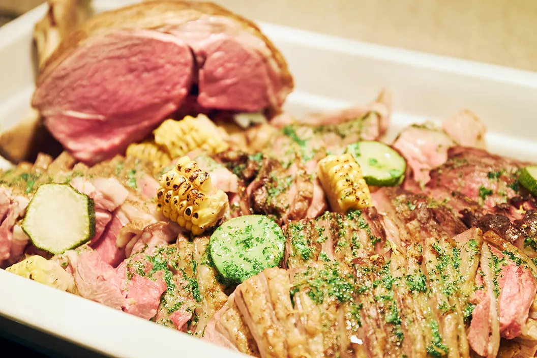 380席ある広々としたダイニングエリアから席を立ち、子どもと手をつないでブッフェ台へ。彩り豊かな料理をプレートに盛り分けていると、「あれ食べたい!」と子どもたちの声。指さす先には、人気メニューのローストビーフ。シェフが目の前で切り分ける姿に、目を輝かせます。