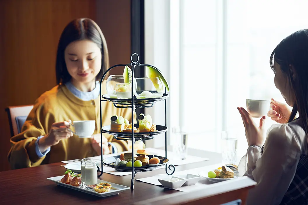 窓一面に広がる景色を眺めつつ、季節のフルーツをふんだんに使ったアフタヌーンティーをオーダー。三段のティースタンドに並ぶスイーツやセイボリーは、どれもフォトジェニックで「どれから食べよう?」とうれしい悩み。時間さえもゆっくりと流れていくような、至福の午後が過ぎていきます。
