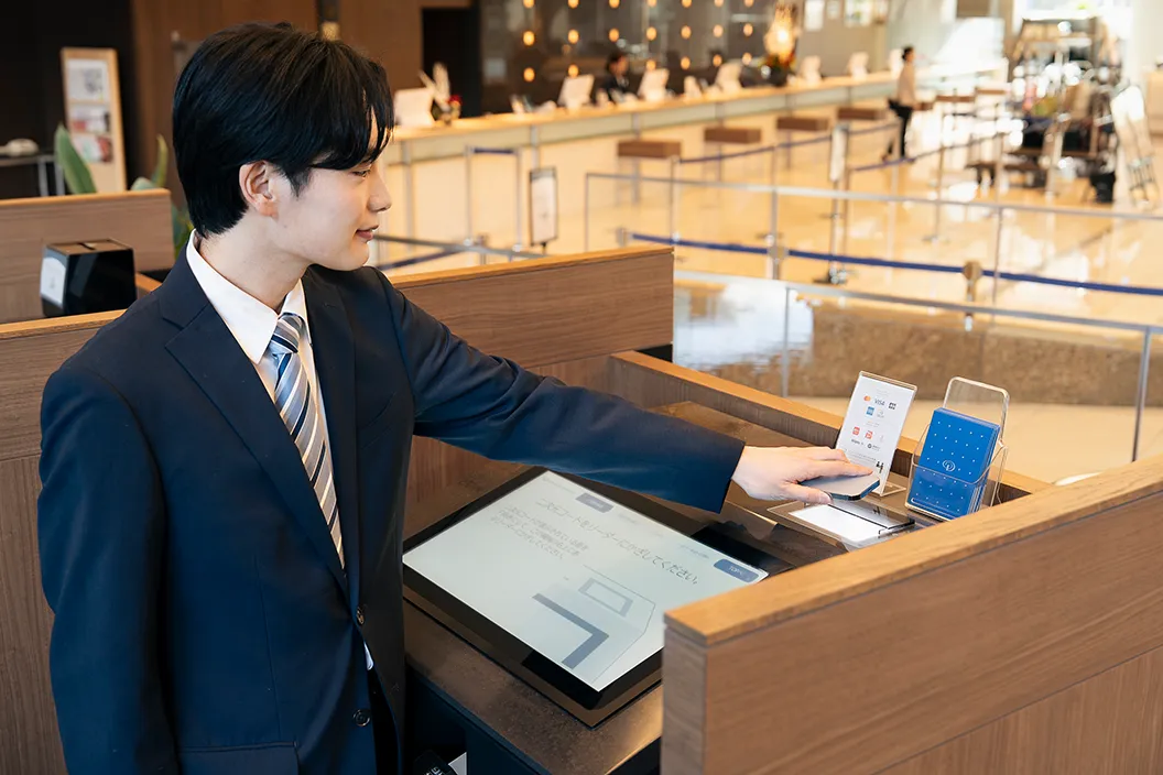 まずは1階ロビーでセルフチェックイン。事前にスマートフォンで取得しておいた二次元バーコードを端末にかざすだけで、簡単にチェックインが完了しました。