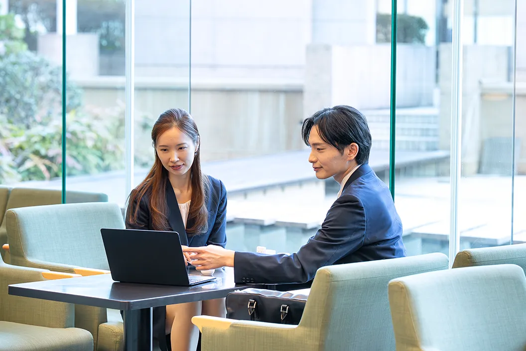 作業がひと段落したあとは、1階のロビーで上司と合流。ロビーラウンジ「ガーデンテラス」にて、取引先との会食の前に、軽く打ち合わせを行います。