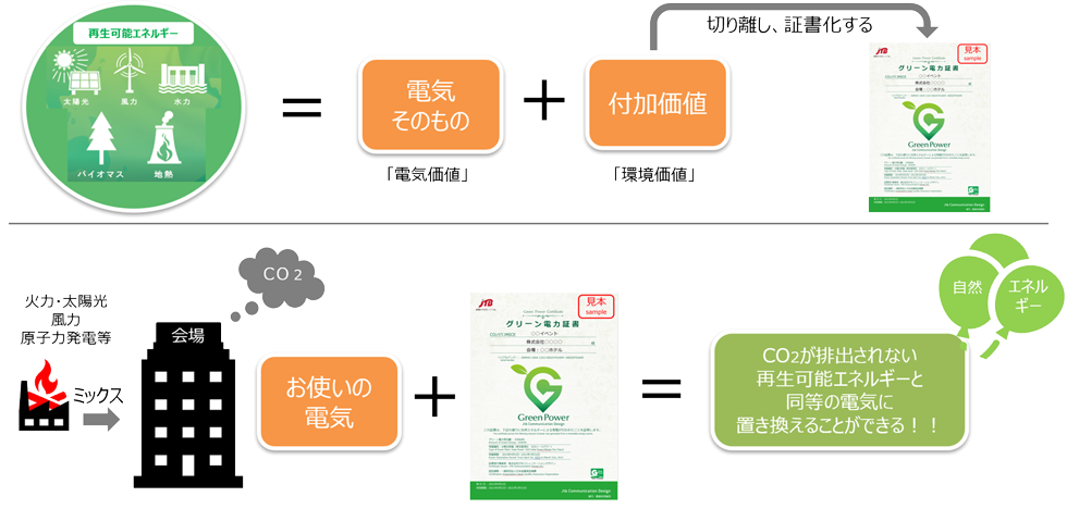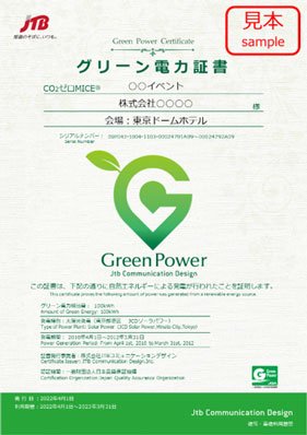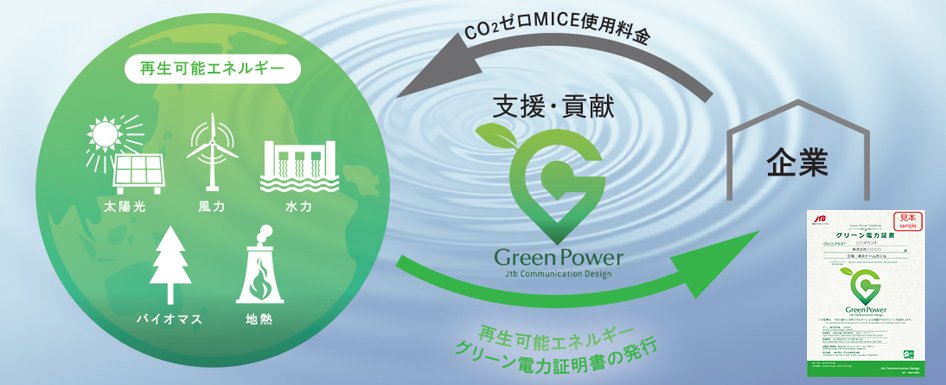 「CO₂ゼロMICE®」はJTBコミュニケーションデザインが進めるグリーン事業で、展示会・学会・国際会議・企業イベント・各種イベント・会議・宴会などに使用される電気を再生エネルギーに置き換えることで、CO₂を実質ゼロにできるサービスです。会場で使用する電気量が再生可能エネルギーの環境価値としてどれほどなのかを算出し、再生可能エネルギー調達・事後検証などを含んだパッケージを利用して「グリーン電力証書」を購入するオプションです。