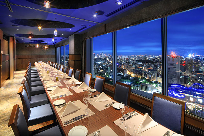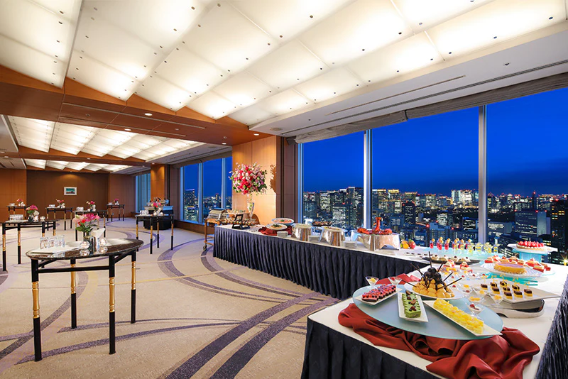 晴れていれば都心の超高層ビル群のスカイラインを望める42F スカイバンケット。ため息が出るほど素晴らしい眺望があります。日が沈む頃には、夕日やイルミネーションもおもてなしの一品。ウェディングパーティにレセプションに、華やかな時が流れます。