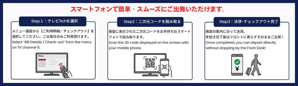 お部屋のテレビ画面の二次元コードをスマートフォンで読み取ることで、フロントに立ち寄ることなくチェックアウトができます。