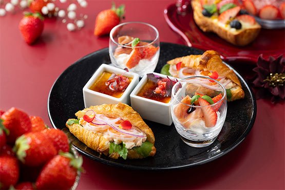 フォワグラのブリュレ 苺のアクセント / サーモンと海老のクロワッサンサンド / 苺とモッツァレラチーズのムース |