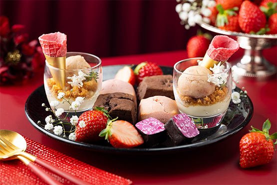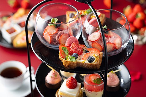 ホテル最上階で楽しめるアフタヌーンティー。見た目にも可愛らしい人気の苺をふんだんに使用した「ストロベリーアフタヌーンティー」をご提供いたします。苺を丸ごと一粒のせた「苺のショートケーキ」や「苺とチーズムースのパフェ」をはじめとするスイーツの数々を、3段スタンドにてご提供いたします。お飲み物は、コーヒー、紅茶、ハーブティー、ビネガードリンクなど約10種類からお好きなだけお楽しみいただけます。地上150mの眺望とともに、眺めて食べて楽しいティータイムをお過ごしください。