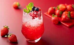 苺の甘酸っぱさにカシスとクランベリーが重なる華やかなノンアルコールカクテルです。ソーダの泡とミントの香りの爽やかさがアクセントとなった一杯です。