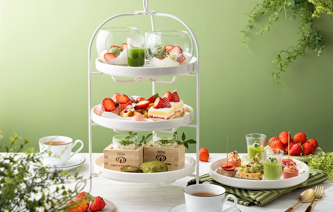 ホテル最上階で楽しめるアフタヌーンティー。赤と緑のコントラストが美しい、和テイストをとりいれた「ストロベリー&抹茶アフタヌーンティー」をご提供いたします。「苺大福と抹茶ジェラートの和パフェ ~抹茶のアフォガート~」や「抹茶のティラミス」をはじめとするスイーツの数々を、3段スタンドにてご提供いたします。お飲み物は、コーヒー、紅茶、ハーブティー、ビネガードリンクなど約10種類からお好きなだけお楽しみいただけます。地上150mの眺望とともに、春の日差しを感じるティータイムをお過ごしください。