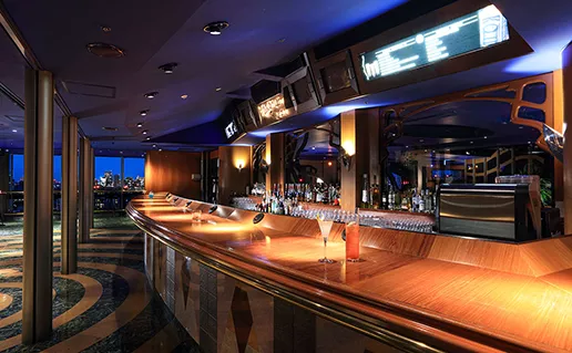 エントランスに位置するキャッシュオンデリバリー方式のスタンディングバー。 お好きに移動できるので、カウンターでお好みのカクテルをオーダーしたり、絶景のガラスカウンターからは北側・南側の夜景をどちらもお愉しみいただけます。
