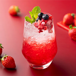 苺の甘酸っぱさにカシスとクランベリーが重なる華やかなノンアルコールカクテルです。ソーダの泡とミントの香りの爽やかさがアクセントとなった一杯です。