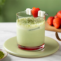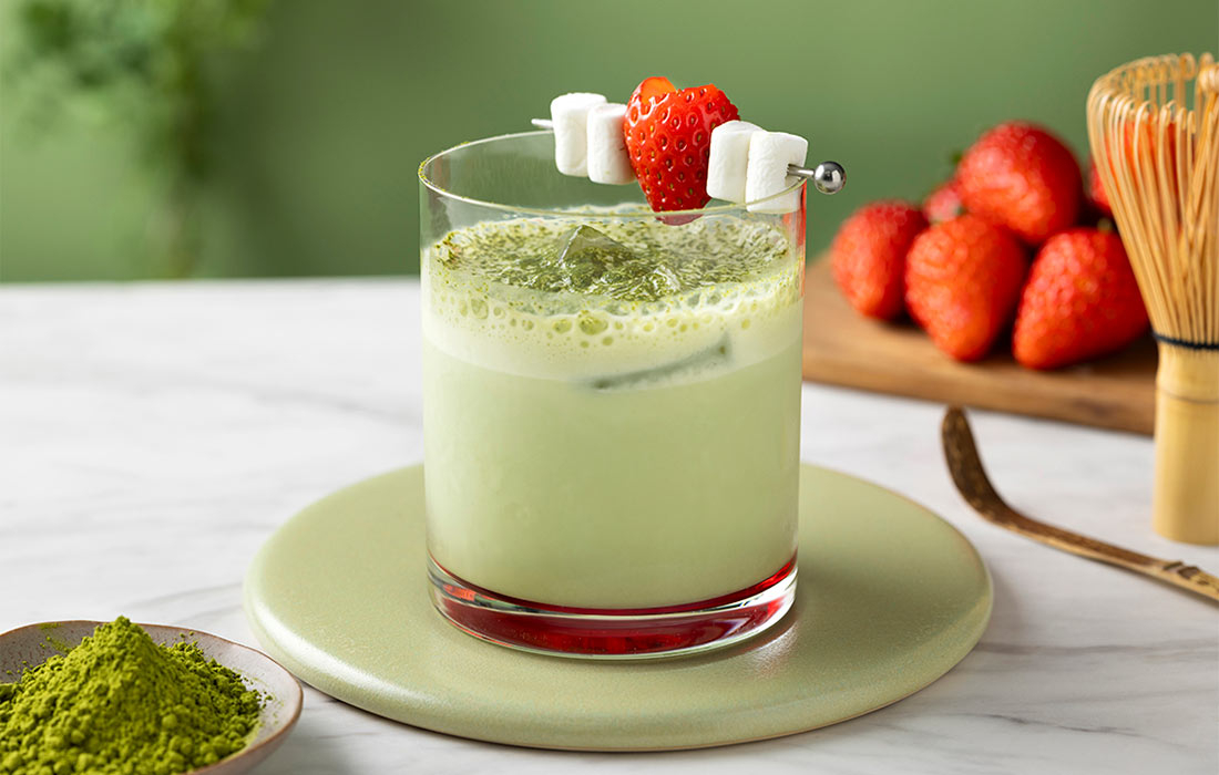 抹茶のほろ苦さと苺のやさしい甘酸っぱさが溶け合うノンアルコールカクテル。ミルクのまろやかな味わいに、添えられたマシュマロをお好みで浸してお召し上がりください。