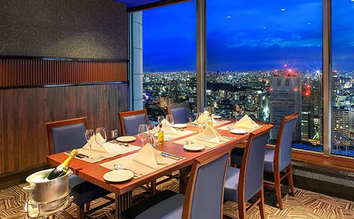 個室確約のフリードリンク付きディナーコース。夜景を一望しながらお楽しみいただけます。