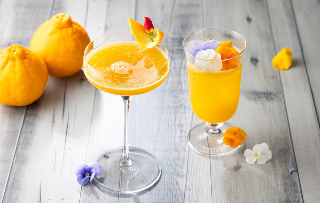 デコポンとシャンパンを合わせ、バックスフィズスタイルに仕上げた春を彩るフラワーカクテル。 |