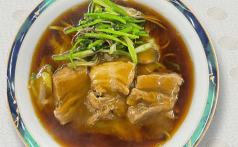牛バラ肉を柔らかく五香粉で煮て、セリと一緒にあんかけ汁そばにした逸品です。