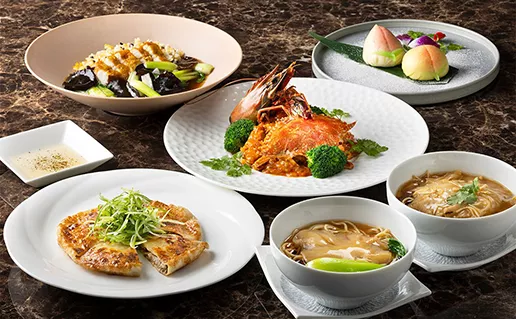 帆立貝の揚げ大蒜の風味蒸しや、上海蟹入りフカヒレ汁そばなど、海鮮料理を楽しめる豪華なコース。