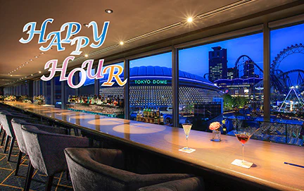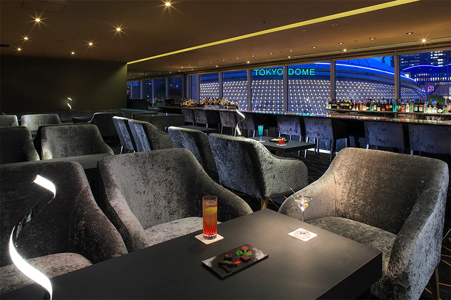18.44メートルのロングカウンターから眺める東京ドームシティのイルミネーションが美しいメインバー。
