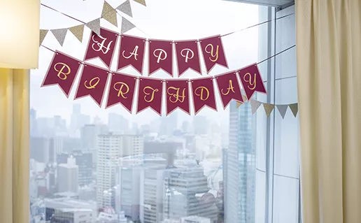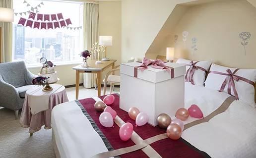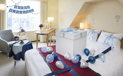 年に1度のお誕生日が一生の記憶に残る素敵な日になりますように、そんな願いを込めた「プレゼントボックスでサプライズ!Birthday宿泊プラン」をご用意いたしました。本プランでは、"大切な人に素敵なお誕生日をプレゼントしたい"というお客様をサポートするべく、1日1室限定でホテルの客室をバースデーパーティのように可愛らしく華やかにコーディネートしてご提供いたします。
