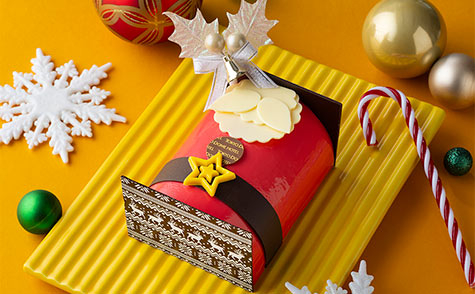 苺とホワイトチョコレートのムースの中に、ピスタチオムースとベリーのジュレを閉じ込めました。サンタクロースがモチーフの可愛らしいクリスマスケーキ。