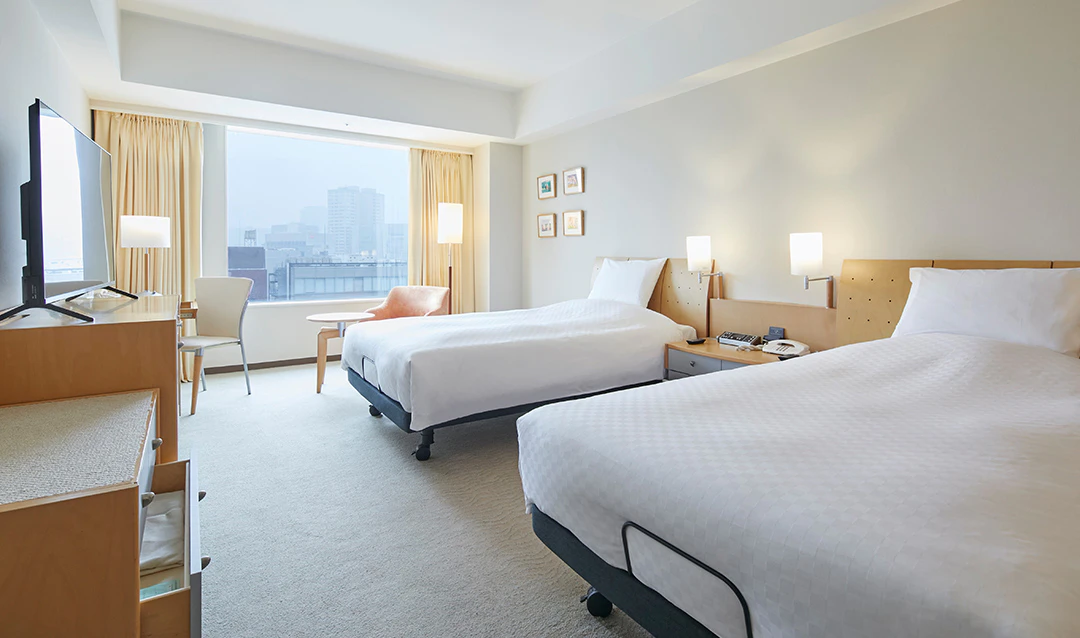 エレガントな色調がくつろぎの空間を演出する高層フロアのツインルーム。開放的な窓からは東京の大パノラマをご堪能いただけます。