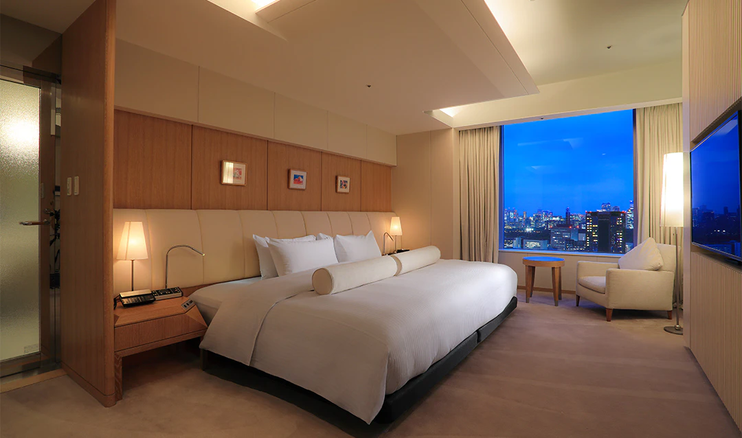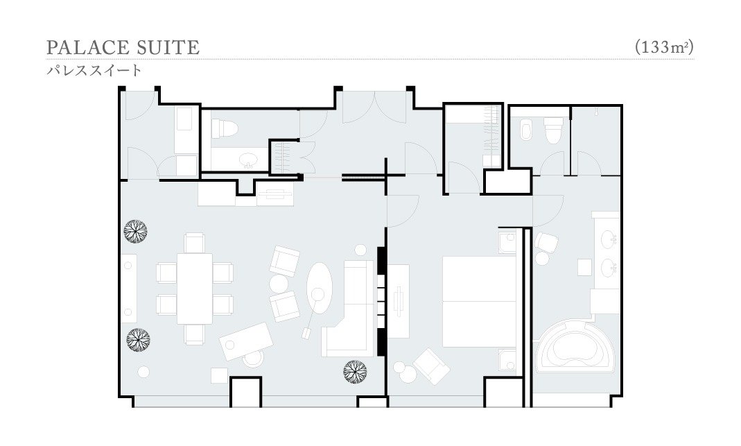 皇居(パレス)側に位置するスイートルーム。窓辺からは、都心の摩天楼や緑豊かな皇居の景色を一望できます。 リビングには白い革張りのソファや、ガラスにメタリックな素材を用いたテーブルを配し、白を基調としたイタリアンモダンテイストにまとめました。バスルームには白い大理石を用い、窓側のジャクジーからの眺望も抜群です。
