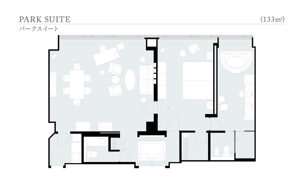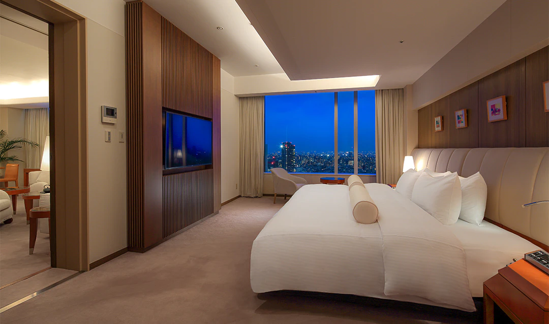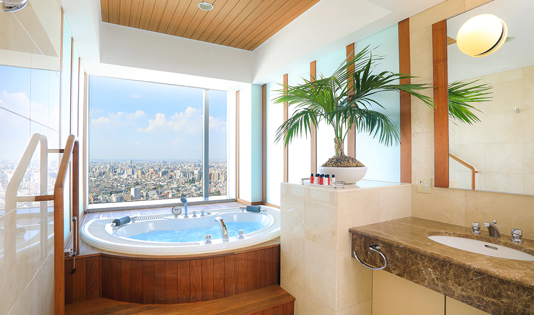 東京ドーム側に位置するスイートルーム。大きな窓からは東京ドームシティはもちろん、閑静な東京を象徴するような上野、谷中の緑あふれる風景など関東平野を一望することができます。室内はダークブラウンの木目を基調とした落ち着いたインテリア。リビングにはオフホワイトの布張りのソファを配し、柔らかな雰囲気に満ちています。ベージュの大理石を用いたバスルームでは、窓側のジャクジーから素晴らしい眺めをお楽しみいただけます。