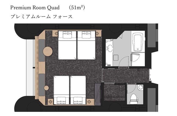 ご家族やお友達同士でゆったり過ごせる、4ベッドタイプのお部屋。窓際にはプレミアムフロアで唯一 ENGAWA ベンチが設置され、和テイストの寛ぎをご提供。皇居の森へと続く都心の風景を、じっくり堪能いただけます。