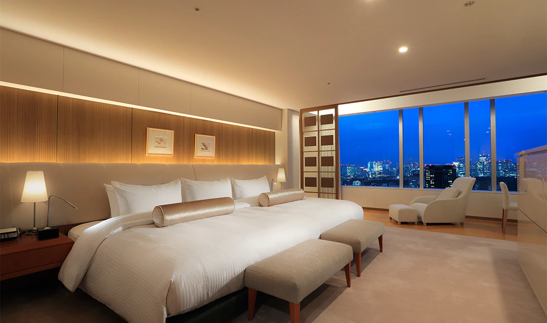東京ドームホテルで最大の広さを誇るスイートルーム。フォーマルな中にも家庭的な温かさを感じさせる室内は、オフホワイトの布張りのソファーやダークブラウンの木目の家具など、落ち着いた雰囲気にあふれています。バスルームの床には大理石を用い、木製デッキで囲まれたジャグジーからは都心の摩天楼や皇居、遠く富士山まで見渡すことができます。