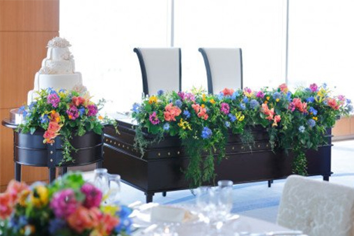 クラシックなディテールに真鍮のスタッズをあしらったメインテーブルと上質感のあるファブリックが会場の開放感を演出