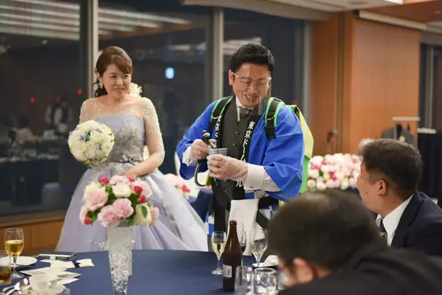 東京ドームホテルオリジナルの余興、ビアサーブを行いました。新郎が法被を着てビア樽を背負い、ゲストにビールを注ぎました。読売巨人軍のテーマ曲を流してゲストの皆様も盛り上がっていただきやってよかったと思います。