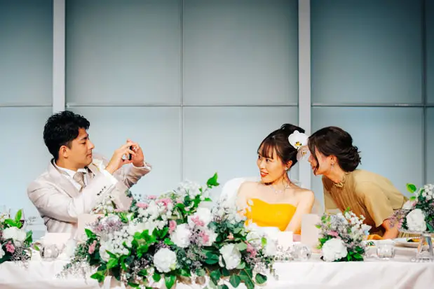 ずっと笑ってたよね!って言われました。本当に楽しかったので・・・。お色直しのカラードレスと料理がとくに好評でした。オレンジのカラードレスお気に入りです!料理は「今までで1番おいしい」「高そう」って言っていました(笑)シェフが目の前でお肉のカッティングサービスをしてくれたのも良かったです!