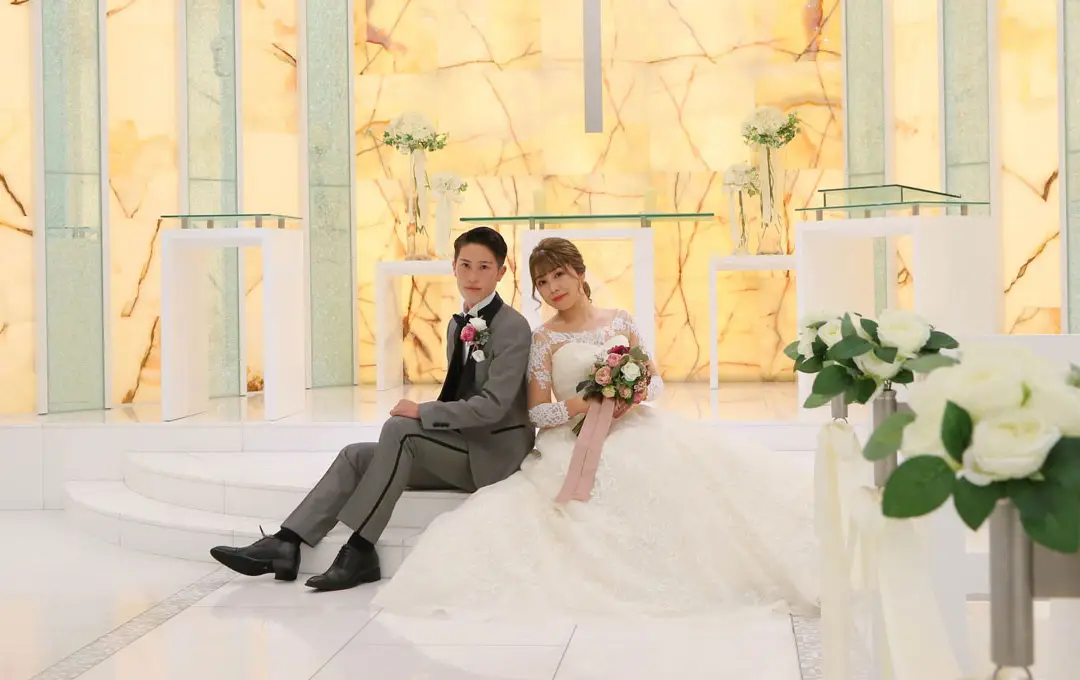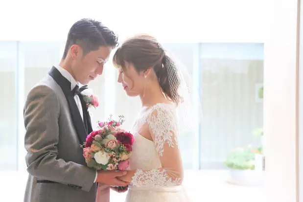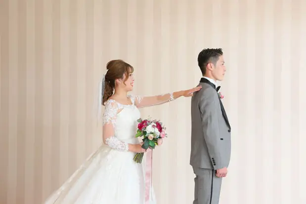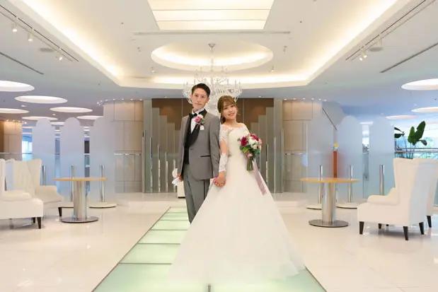 衣裳のテーマを韓国ウェディングにしたかったので、新婦の衣裳はボリュームがあってキラキラしたドレス、新郎はきっちりしすぎず、カジュアル感もあるタキシードを選びました。ホテルの雰囲気にぴったりでした。