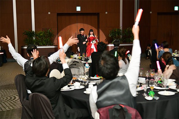 お式はコンサートさながら、とても楽しかった!とたくさん言っていただきました。とくにジェットスモーク、オリジナルペンライト、金テープとワンダーフライト、全部に歓声が沸いていてうれしかったですし、ゲストも感動してくれました。金テープにワンダーフライトにペンライトと、細かいグッズは、角度や持ち方や映し方にこだわって写真を撮ってくれていました。推し色が選べるオリジナルカクテルも好評でした!